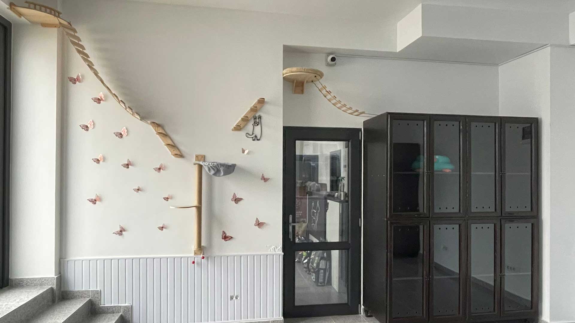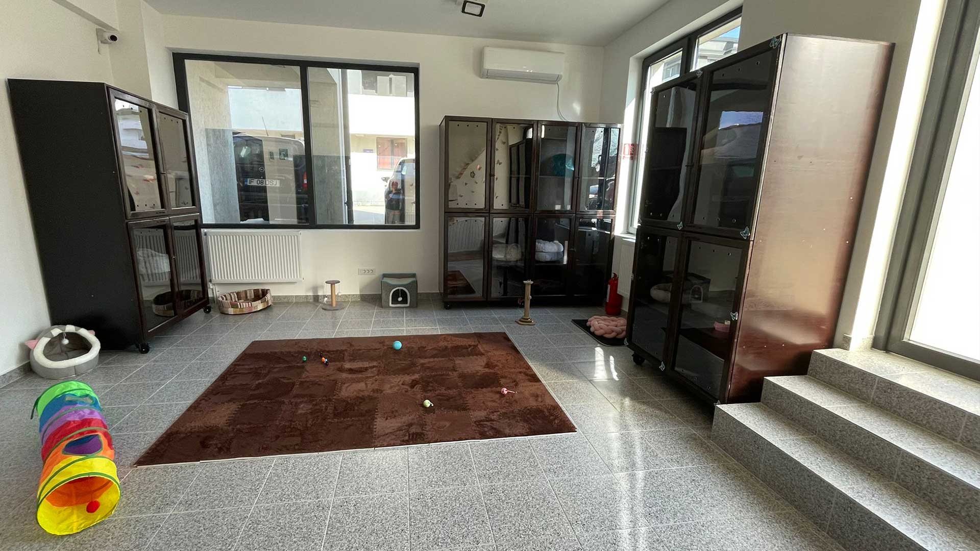 Zone dedicate pentru joacă cu trasee de cățărat și puncte de odihnă suspendate. Pisicile beneficiază de timp liber și joacă în afara cuștii pe timp de zi.